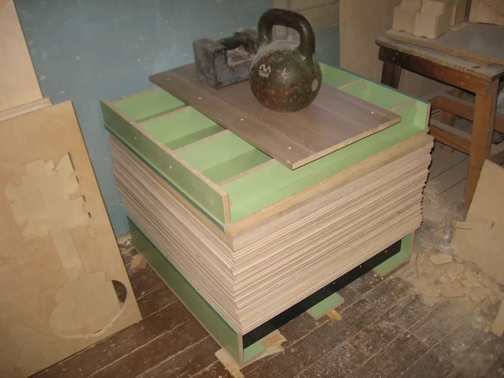 - Храните пачку фанеры под прессом с равномерной нагрузкой. Это может быть что угодно: кирпичи, плитка керамогранита, тяжелый инструмент;