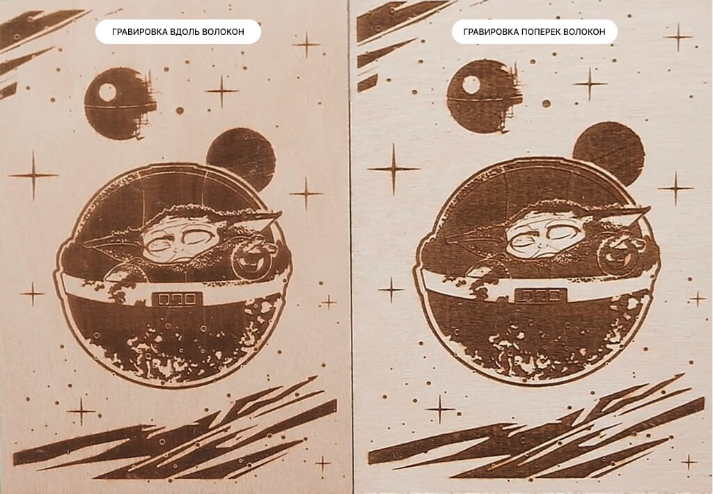 Начнем с азов: фанера — это дерево, природный органический материал, у которого есть волокна. Их можно увидеть даже невооруженным глазом. Весь секрет в том, что гравировка будет выглядеть лучше, если наносить её поперек волокон. Сравните сами 👇🏻