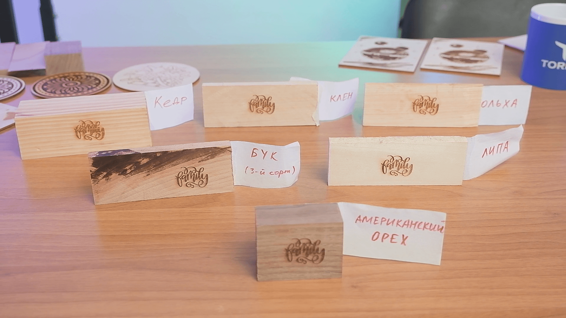 Все гравировки на фото выше сделаны на одних и тех же параметрах — скорость, мощность, шаг, обдув. Разница только в породе дерева.
