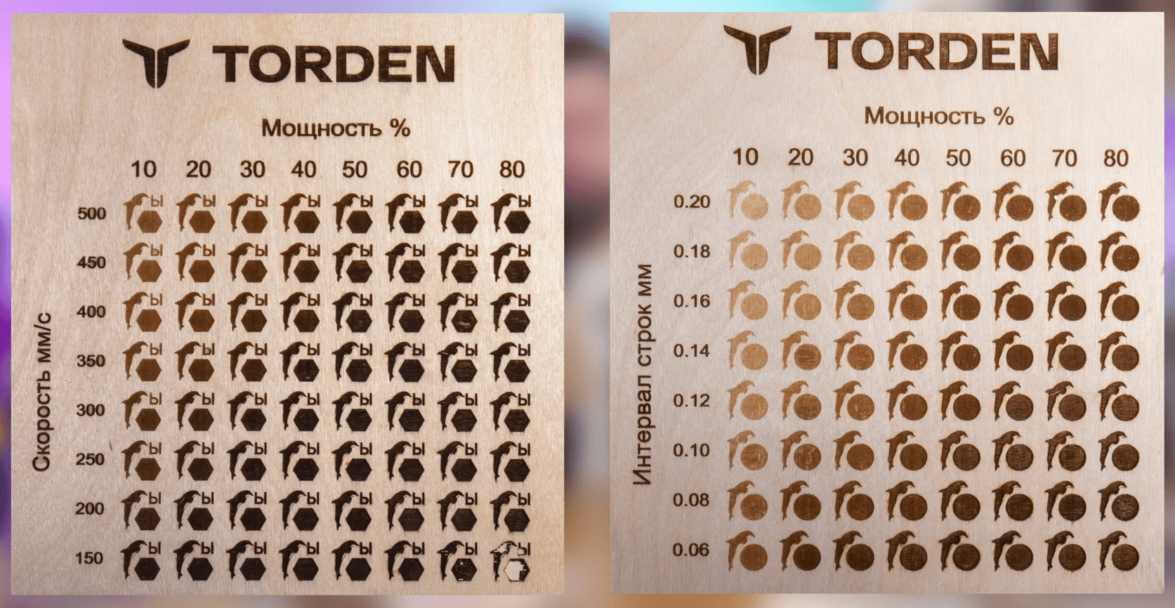 На левой отражена градация оттенков цвета в зависимости от скорости и мощности. Один раз делаем себе такую таблицу, кладем рядом со станком и больше не тратим время на подбор нужных параметров.