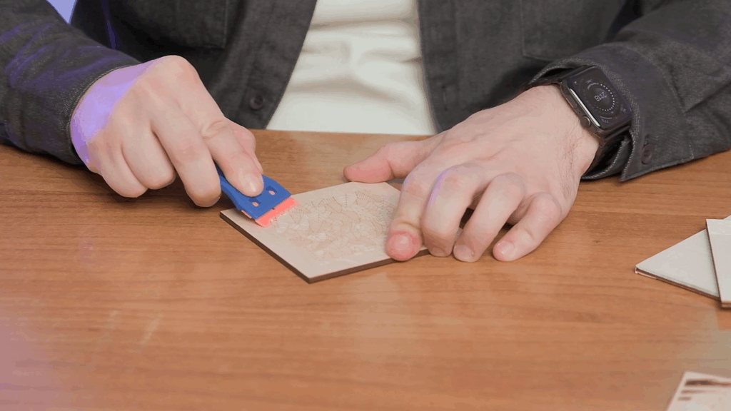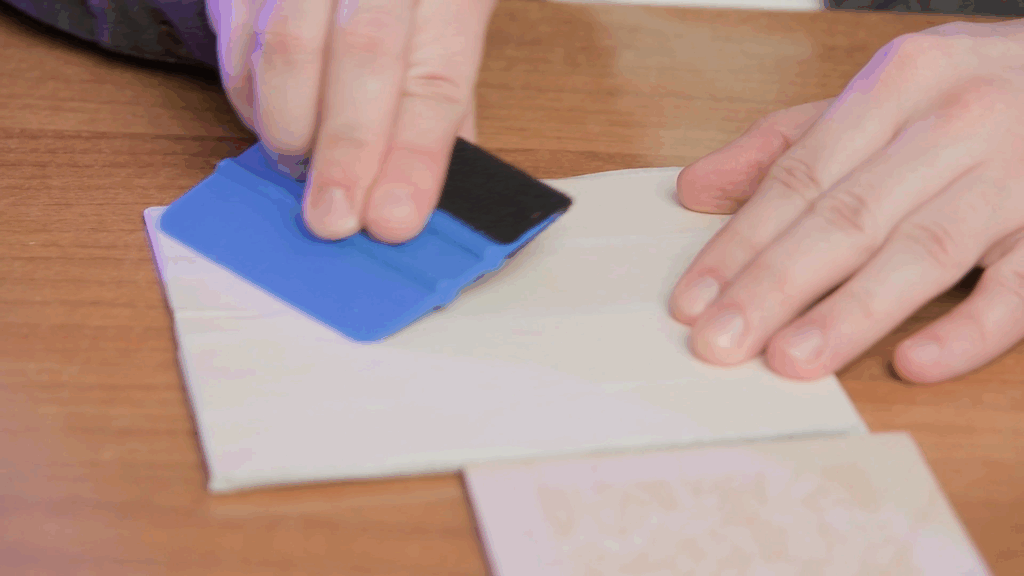 - Чтобы нанести скотч равномерно на фанеру, используйте пластиковый ракель (такой применяется в детейлинге для тонировки). Разгладьте малярную ленту по поверхности и отдельно пройдитесь ребрами ракеля.