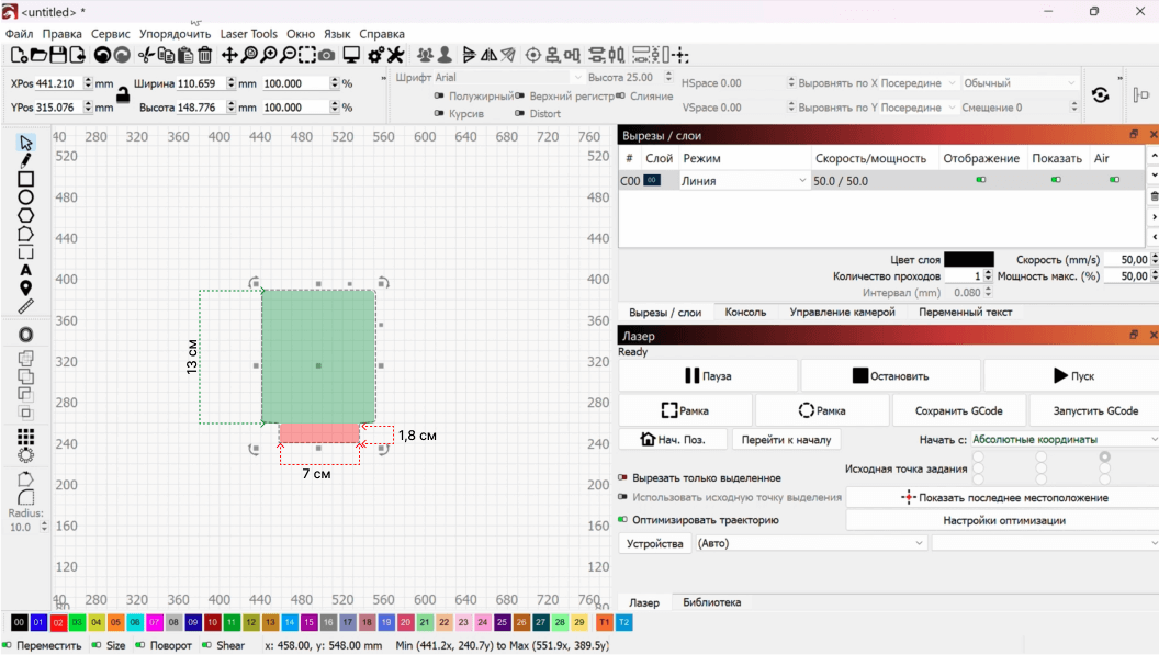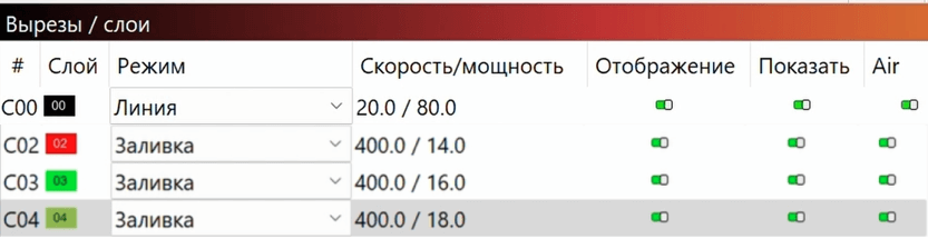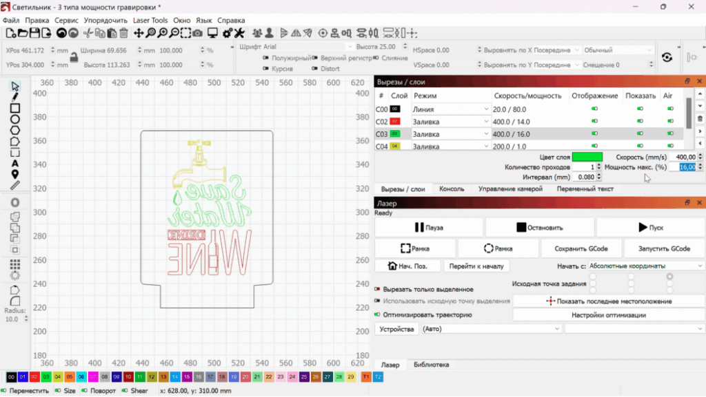 Далее переходим к подбору параметров обработки. Напомним, что для изготовления светильника мы использовали лазерный CO2 станок TAURUS 1070 с излучателем COLT RX90 (90-100 Вт). Параметры следующие: скорость 20 мм/с, мощность 80%. Для всех элементов гравировки поставили одинаковую мощность, однако в некоторых случаях будет полезно выставить разные значения в зависимости от того, где располагается элемент рисунка в светильнике. Логика следующая — свет идет снизу от подставки и чтобы все части ночники освещались равномерно, можно постепенно увеличивать мощность от нижних элементов гравировки к верхним ⬇️